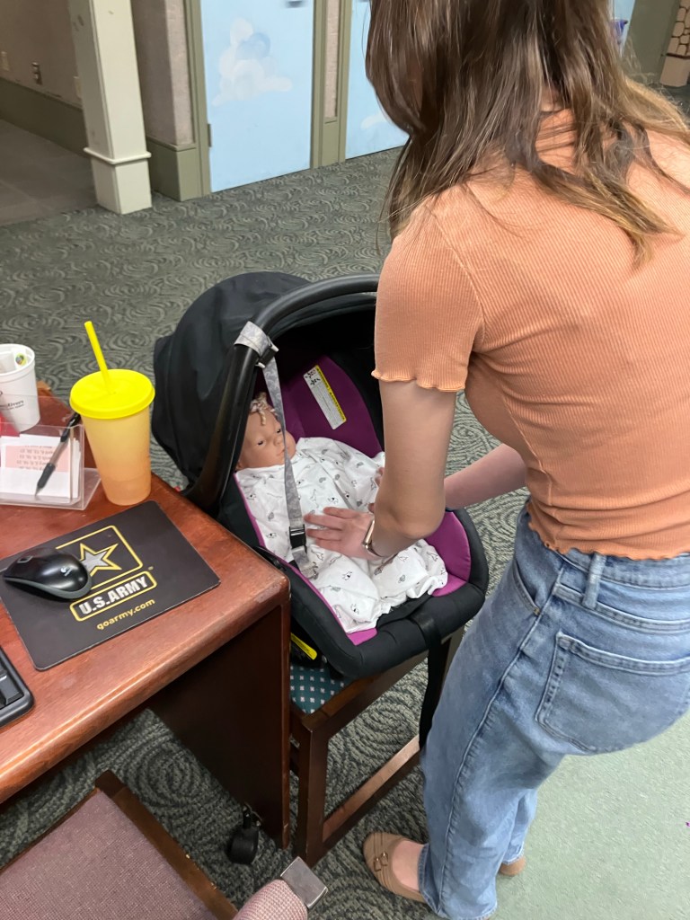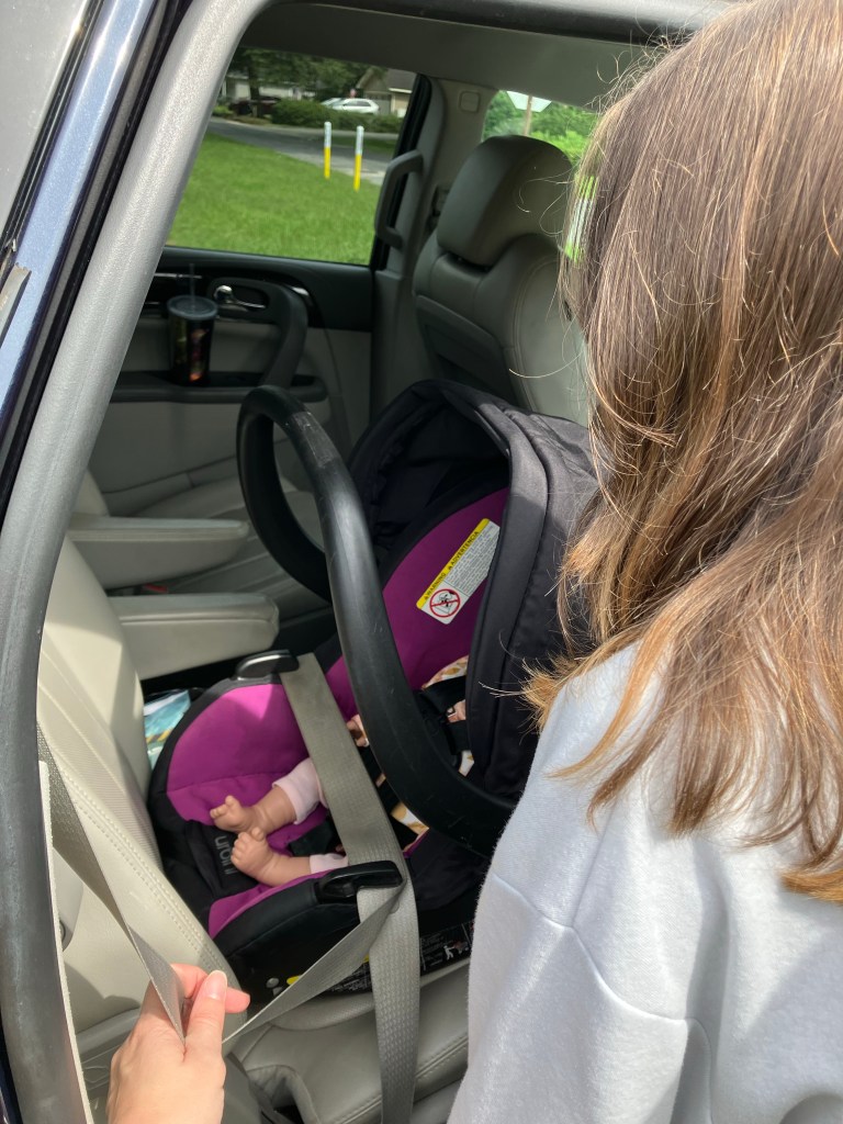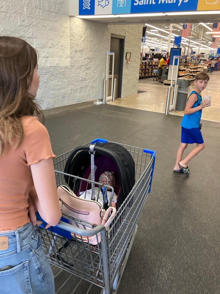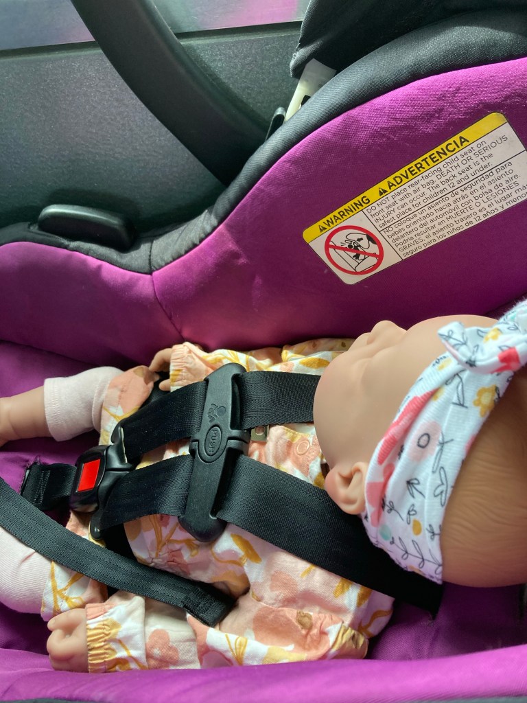 Day 2: Saturday, they woke up a bit later than usual, which was expected for a new “mom”. My daughter took the time to dress her doll in a cute outfit, swaddle her, and put on a hand-crocheted headband. Our plan was to run errands to Walmart and the library. Just as we were ready to leave, with the baby securely strapped into the car seat, Idalia started crying. My daughter had to take the doll out of the car seat, thinking a diaper change was the issue. But it turned out that she needed to be fed for about 20 minutes. I remember those days of rushing everywhere due to unexpected diaper blowouts, impromptu feeding sessions, spit-ups, and outfit changes. Luckily, we had plenty of time on this relaxed Saturday, so I agreed to the delay.