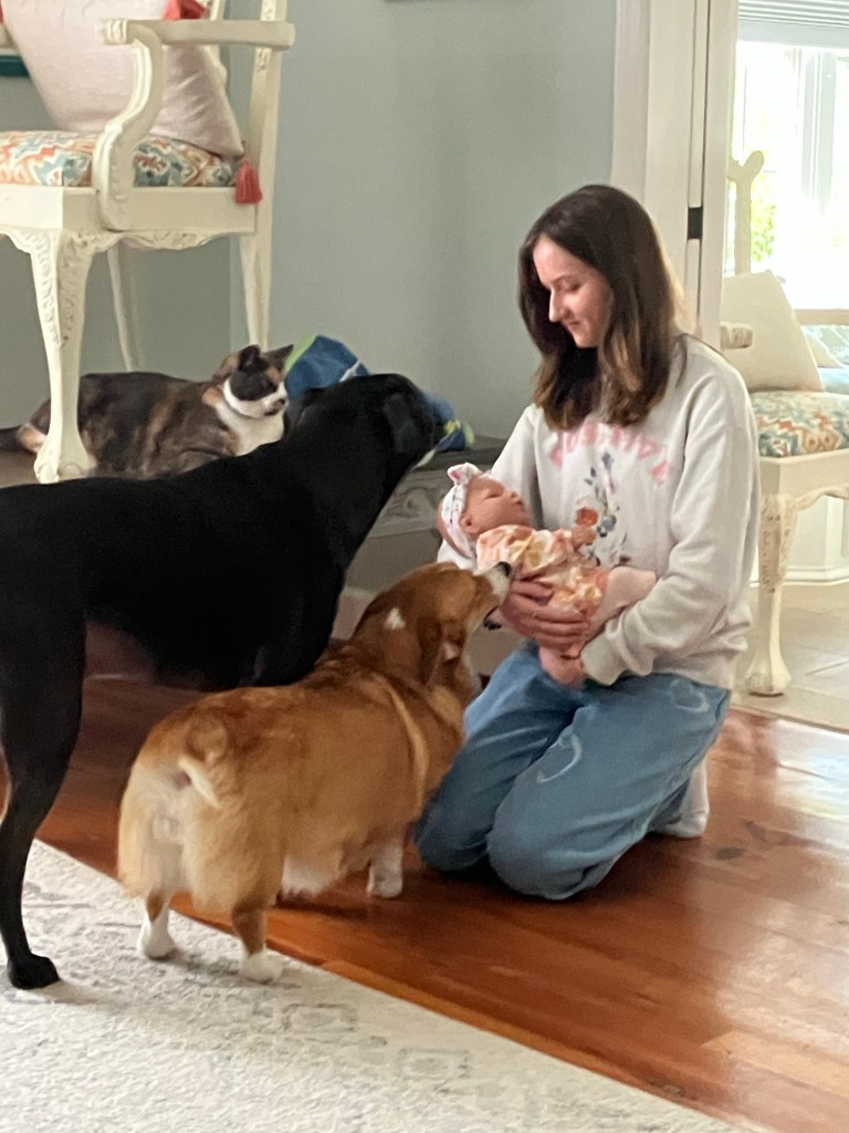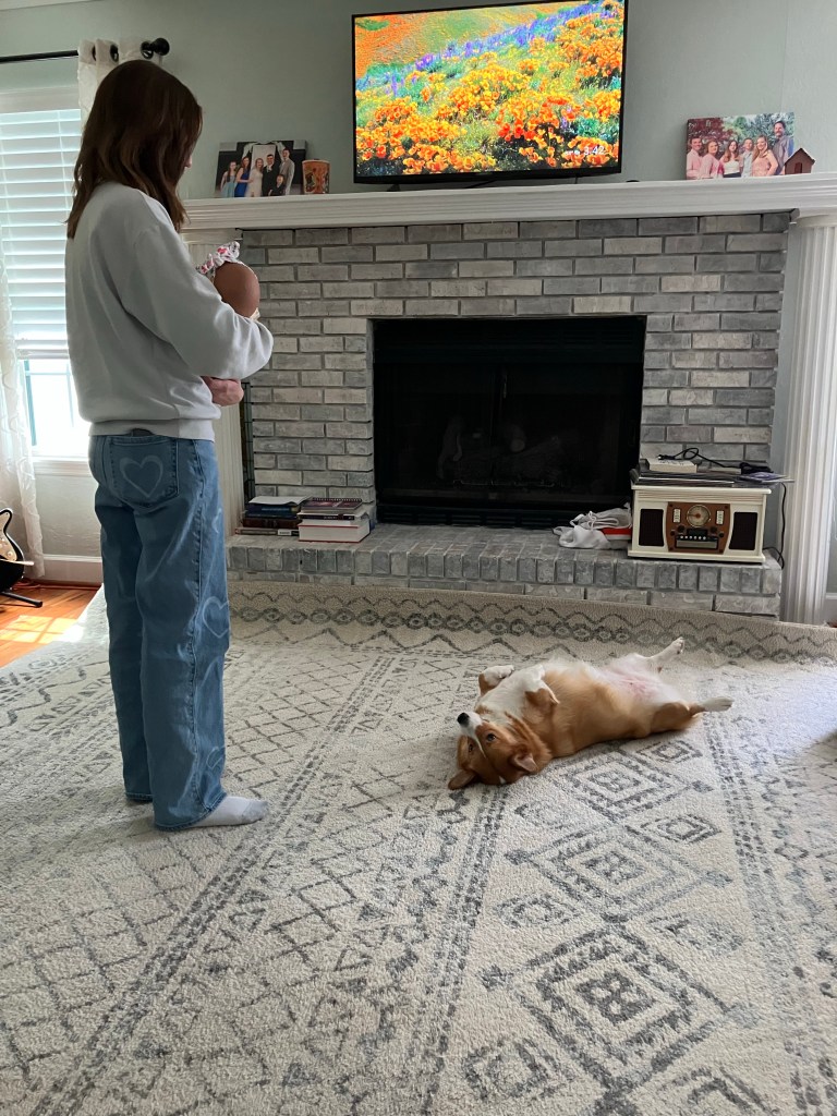 Once she was safely secured in the car, we drove home to introduce her to the rest of the family. The baby had been scheduled to activate at 4pm, so we had a few moments to prepare. My daughter was excited to show off the cute outfits she had picked out. After that, it was time for our pets to meet the new addition. Our little corgi immediately showed submission by rolling over onto her back. The other pets approached cautiously, sniffing with curiosity. However, they soon realized that something was different. It was almost as if they were thinking, “Why are our humans using fake babies instead of real ones?” This reflection reminded me of my experiences taking care of my siblings and babysitting from a young age, starting at 12 years old. But I digress.
