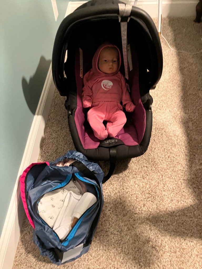 Day 1: On Friday, I received a text photo of my new “grandchild” named Idalia, along with a request to pick them up from the bus stop. Knowing how difficult it can be for parents to handle a car seat, a personal bag, and a diaper bag all at once, I realized the 1/3 mile journey home under the afternoon heat would be challenging. My daughter had also gone to school feeling under the weather and likely needed some assistance. Without hesitation, I was already on the way. The doll was named Idalia, in honor of the hurricane that narrowly missed our area and delayed her arrival by a week.