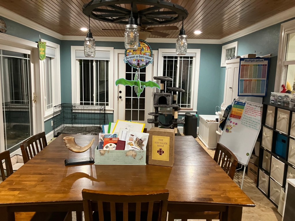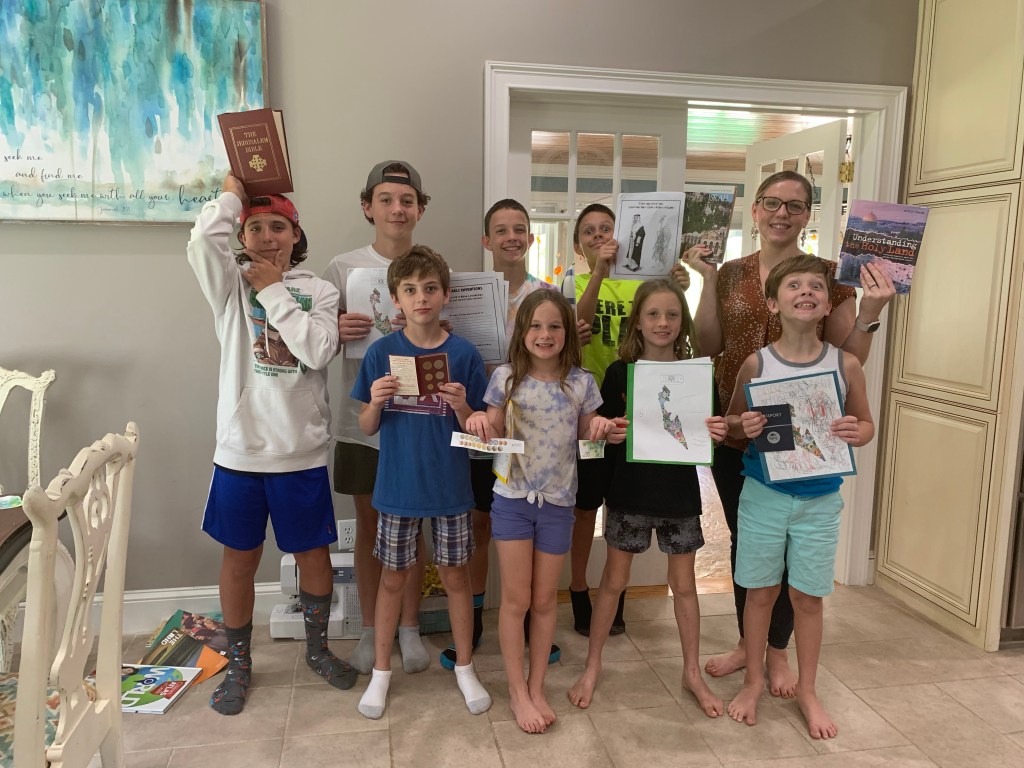 Below is a timeline of how the immersive unit study unfolded. Normally, the MFW curriculum spreads out the activities over the course of the week. However, we intentionally saved all of the Israeli activities, focusing solely on academics during the first part of the week, so that we could have an incredible journey with our friends. This immersive format was really a whole new way of engaging my child’s attention, as we usually homeschool solo, except for homeschool days. We were excited to have four families participating, with a total of nine kids, mostly elementary and middle school aged. To ensure that the children remained engaged throughout the long lessons, I planned a strategic room-to-room schedule for the day. We began in the homeschool room where I introduced the lesson and country of Israel on a large map. Next, we moved to the kitchen where we made Challah together. The dining room acted as our main workspace, and the living room was transformed into an airplane area that transported us to Israel.
