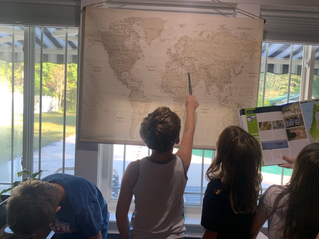 - Start in the homeschool room, introduce activities, gather around a large wall map to locate Israel on the map and discuss its geographical location.