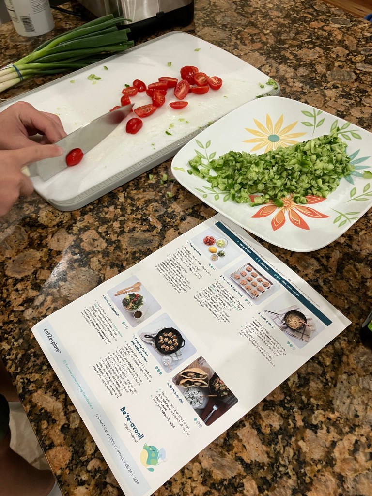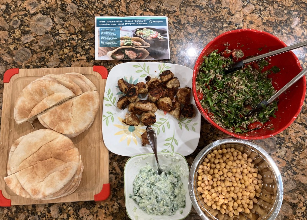 - Move to kitchen: Place Challah into oven and bake at 350 for 30 minutes. Now, make ground turkey falafels with cucumber yogurt and quinoa tabouleh from Eat2Explore, or any other recipe that you’ve chosen!