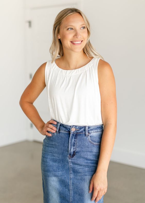 • Structured Blazer and Blue Jean Jacket: A single tailored blazer adds sophistication to any ensemble and can be dressed up or down as needed. On the other hand, a blue jean jacket helps dress down outfits while providing coverage for tanks.