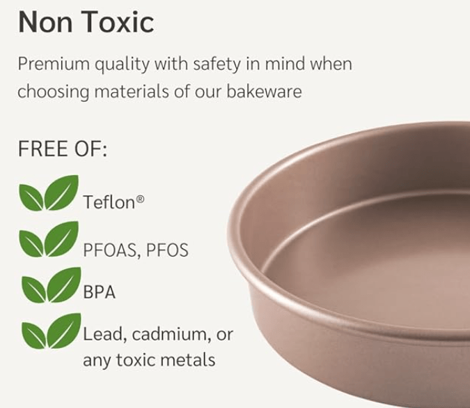 Now let me tell you about my favorite cake pans! I found Happiels Non-Toxic, Non-stick pans to be exceptional. With extra thick rims and carbon steel construction, these pans offer superior heat conduction. They are truly non-stick and free of PFOAS, PFOS, and BPA, making them a safe and reliable choice for all your baking needs.