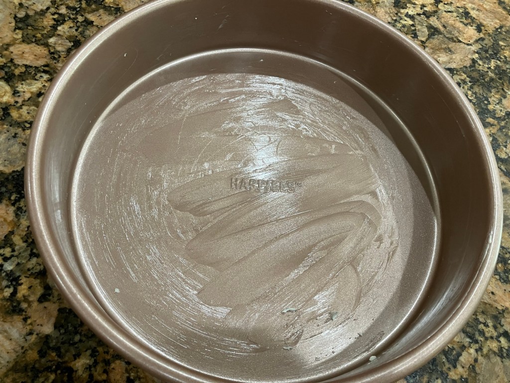 - Grease a 9-inch cake pan, or bundt pan, with butter or oil.