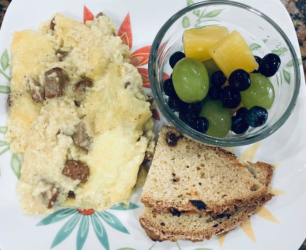 This warm and satisfying main dish features tender stew meat, mixed vegetables, and diced potatoes. Paired with freshly baked challah, it’s the ultimate comfort food experience.