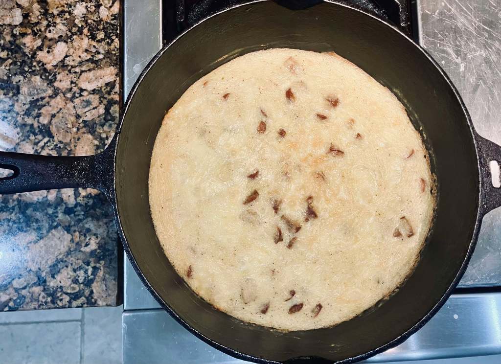 - Pour the batter evenly over the fruit, spreading gently to cover most of the surface.