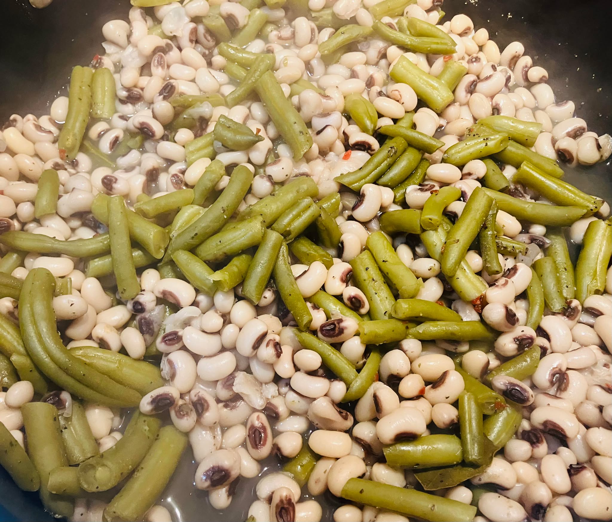 Add black-eyed peas, green beans, salt, pepper, red pepper flakes, and bay leaf.