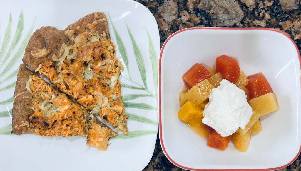 Family-friendly pizza night featuring homemade gluten-free pizzas made with Loopy Whisk’s incredible crust recipe—truly one of the best gluten-free doughs I’ve tried. We used slow-cooked leftover chicken to create a flavorful buffalo chicken dip pizza, and of course, kept things simple with a classic cheese pizza for the kids. Served alongside tropical mixed fruit topped with a dollop of whipped cream, it made for an easy, satisfying meal that felt like a treat.