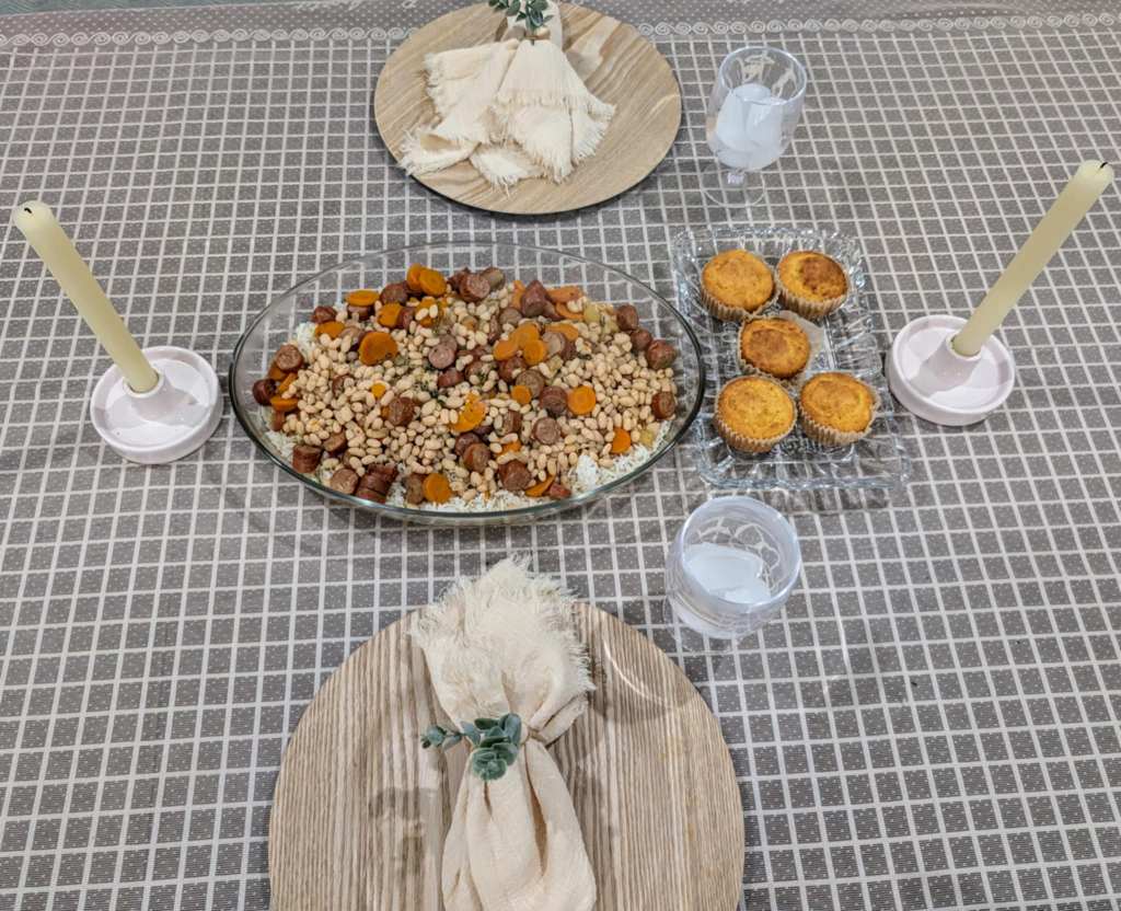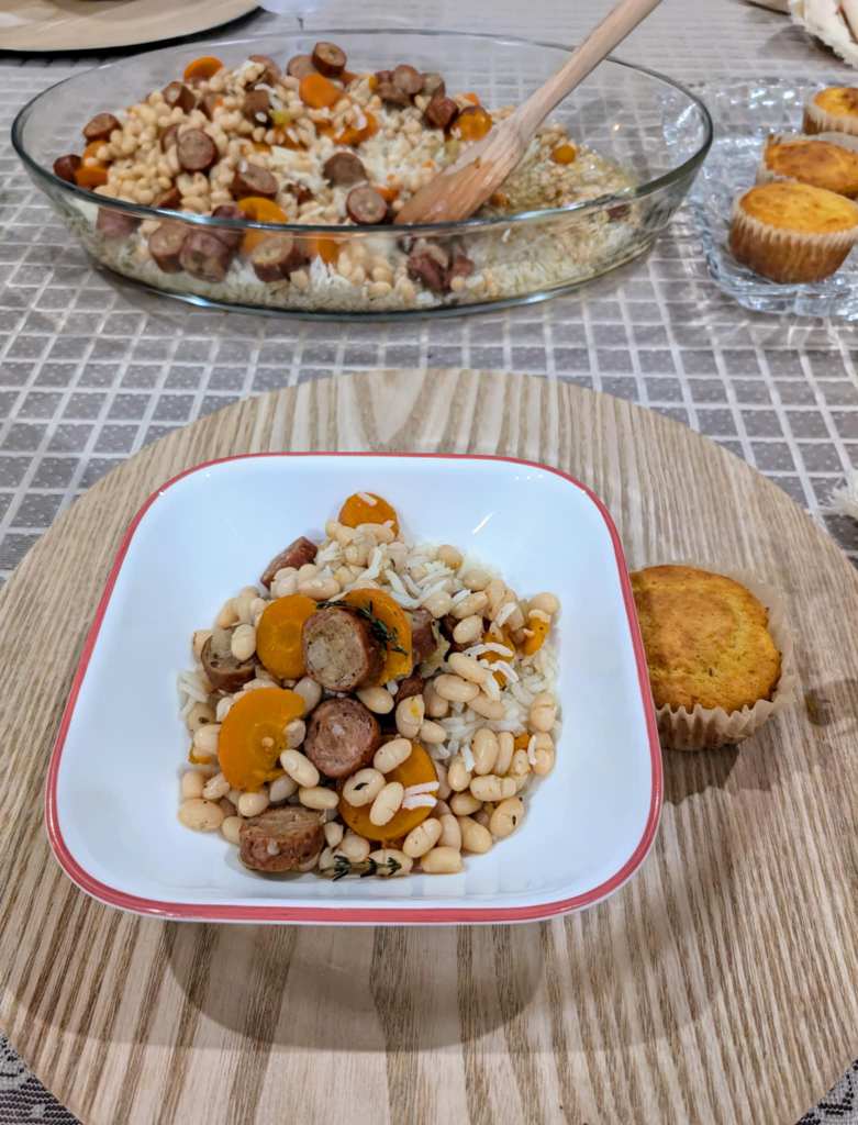 On the fifth evening of our meal series, we dug into a comforting, retro-inspired classic: a hearty pot of beans with rice and cornbread muffins—just like something you’d find simmering on a 1950s stovetop.