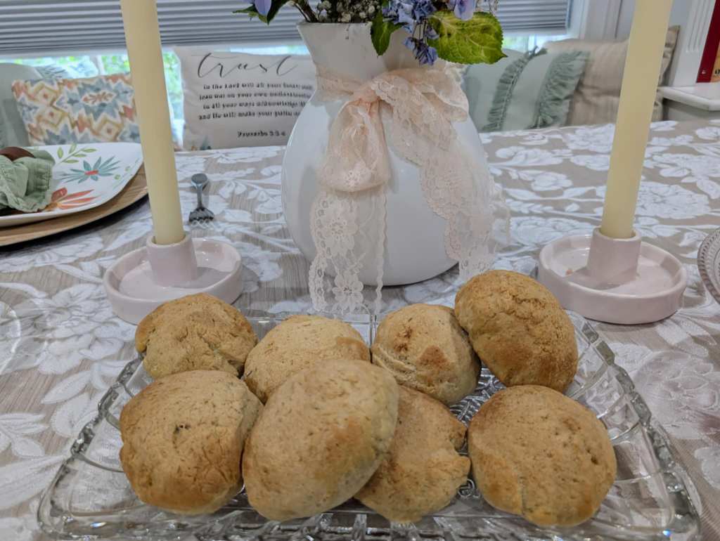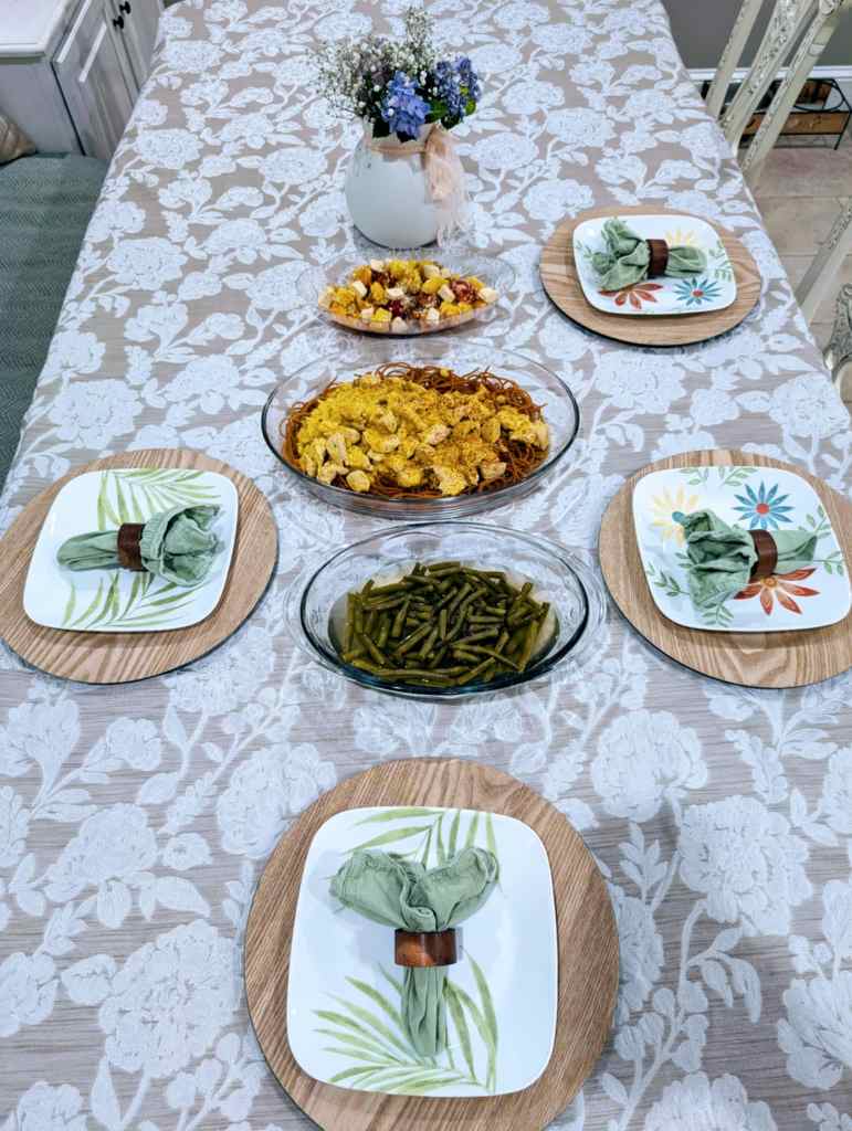 Usually, we’re pretty casual with dinner—plates loaded right from the stove, eaten at the kitchen island. But this time, I took a little extra care: I transferred everything into serving dishes, set the farmhouse table, and added thoughtful touches like fresh herbs, lemon wedges, colorful veggies, and homemade breads and desserts.