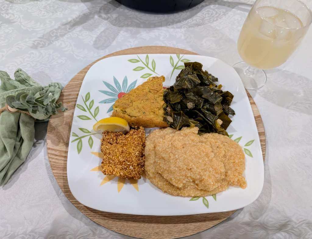 Thanks to the season’s bounty, I was able to find fresh collard greens, and I used my go-to Southern Greens recipe. A quick note: the recipe card has a small omission—the sugar should be measured at ½ tablespoon, and I prefer to use raw cane sugar.