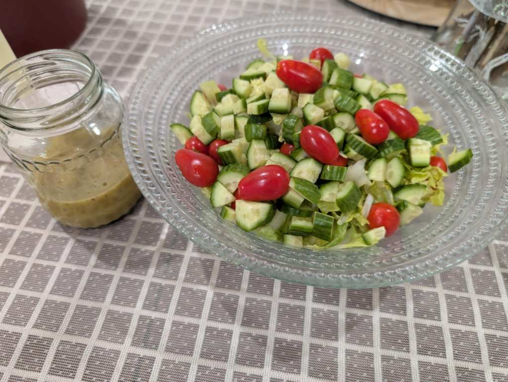 To round out the meal, I served a simple garden salad made with chopped romaine, diced cucumbers, and cherry tomatoes fresh from our garden. For the dressing, I whisked together a quick homemade red wine vinaigrette—bright, tangy, and the perfect complement to the fresh veggies.