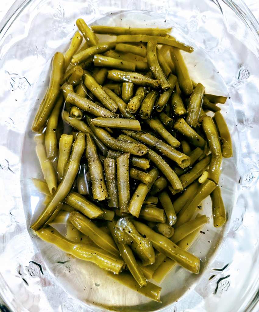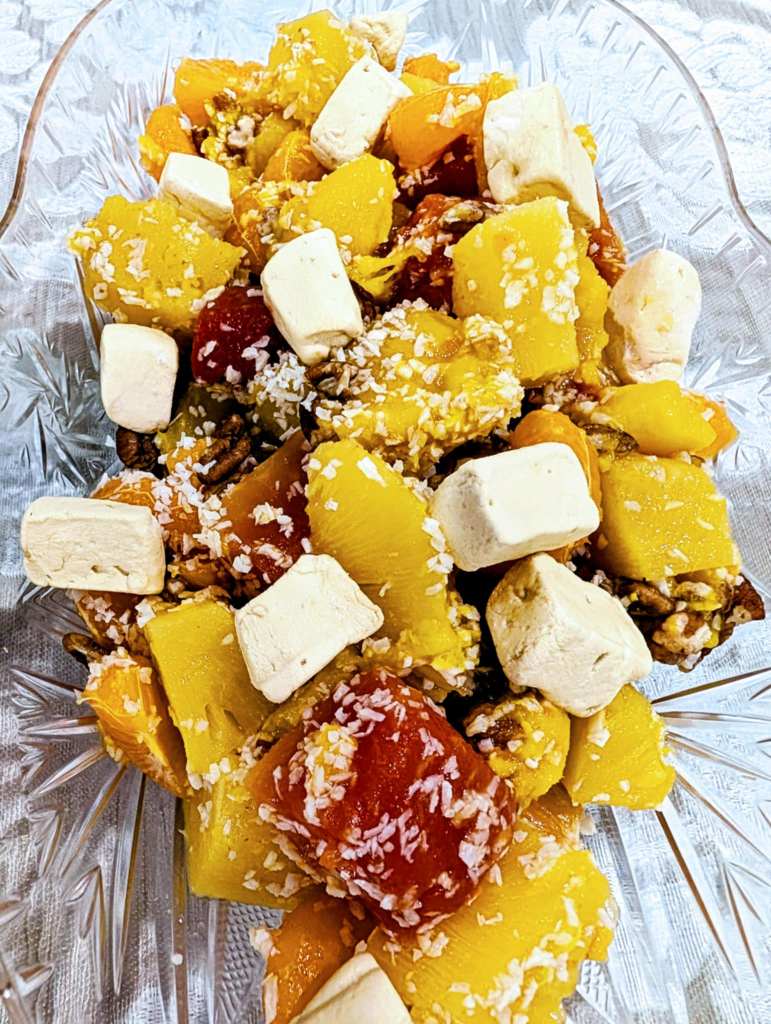 On the side, we had home-canned green beans—just like Granny used to make—and a lightened-up Ambrosia fruit salad. I skipped the heavy whipping cream and cream cheese, instead tossing mixed fruit with crushed pecans and shredded coconut. We even swapped out the artificially flavored and colored marshmallows of years past for homemade marshmallows.