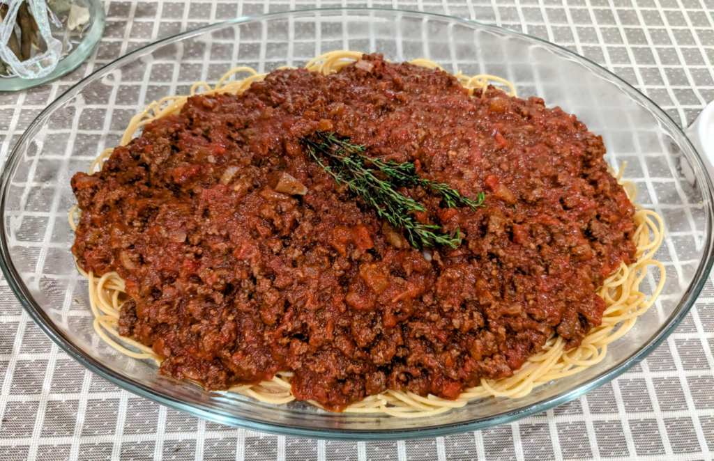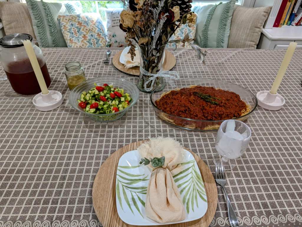 On the sixth night of our meal series, we took a culinary trip to Italy—by way of 1950s California! I followed a charming vintage recipe from 1950s California Spaghetti Sauce | Vintage Family Dinner, and the results were absolutely delicious. The rich, red wine-infused meat tomato sauce was served over a bed of gluten-free spaghetti noodles, which held the savory sauce beautifully.