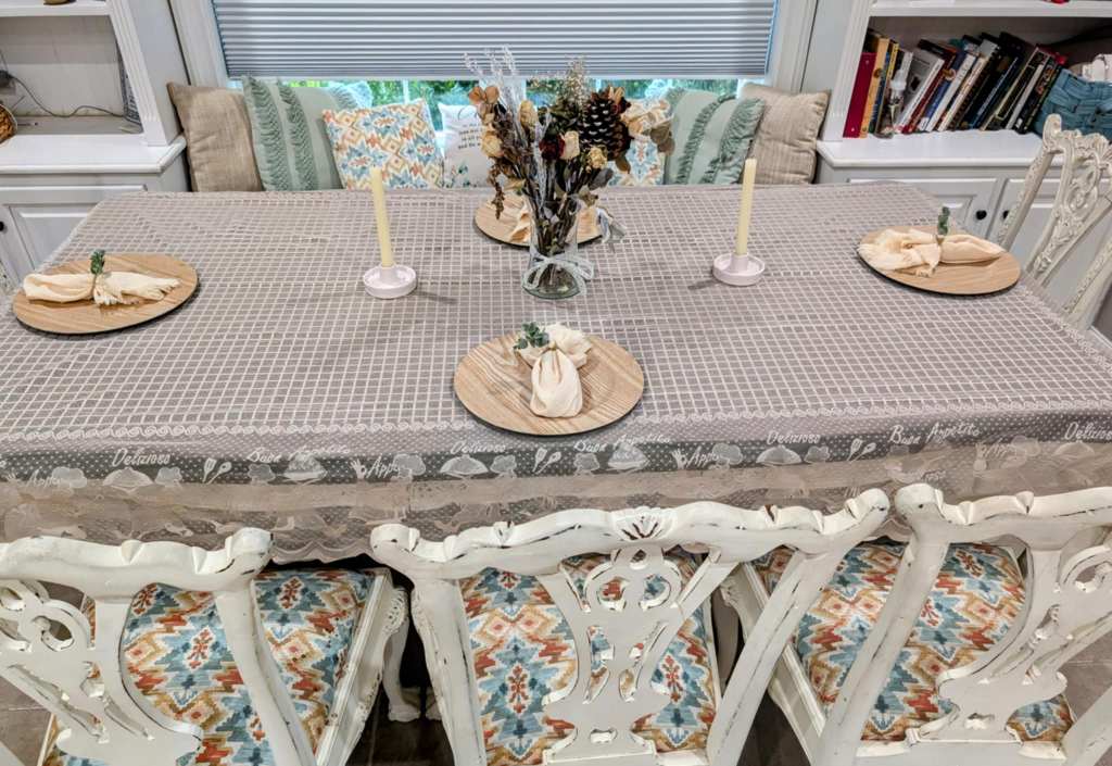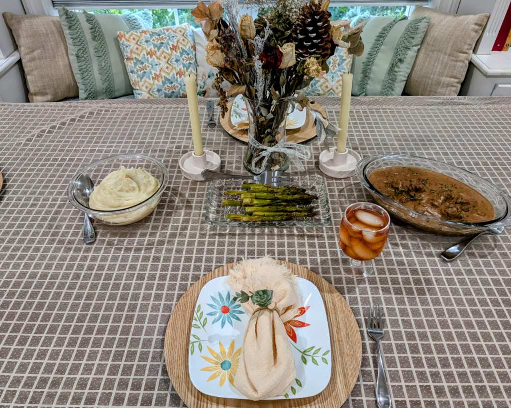 I’m still rocking the Corelle dishes, which last forever, but I’ve refreshed my kitchen table with brand-new tablecloths, napkins, and napkin rings, for that 1950s aesthetic appeal. I’ve created decadent table settings, complete with elegant tablecloths, proper place settings, and floral centerpieces, which were prominent in that era. These small touches don’t have to be reserved for special occasions.