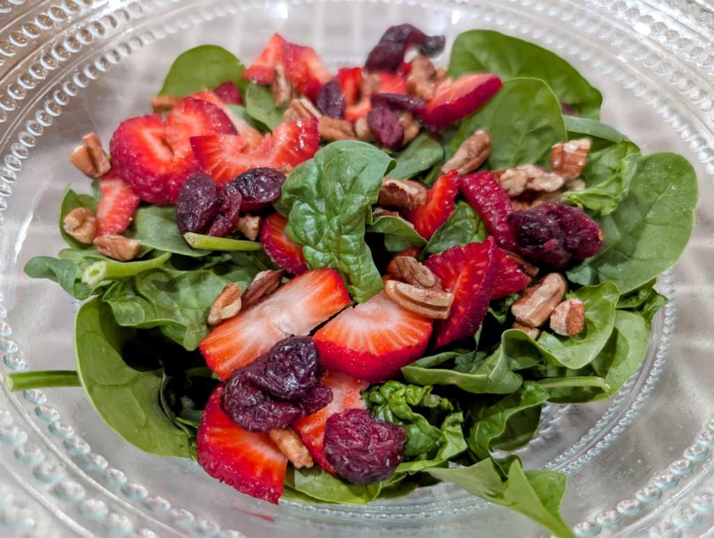 I served it with leftover millet rolls and a refreshing summer salad made of spinach, strawberries, dried cranberries, and pecans—all tossed in a quick homemade balsamic dressing.