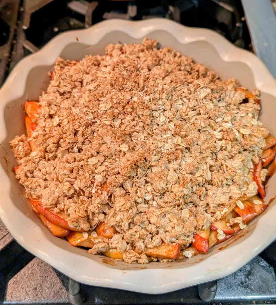 This gluten-free, dairy-free apple crisp is baked in a deep-dish pie pan and makes the perfect cozy dessert. To start, preheat your oven to 350°F and lightly grease an 8–9″ pie pan. Slice 4–5 Gala apples (about 1 ¾ pounds) and toss them right in the pan with ¼ cup maple syrup, 1 ½ tablespoons water, 1 ½ teaspoons apple cider vinegar, 1 ½ teaspoons arrowroot (or 2 teaspoons cornstarch), ¾ teaspoon cinnamon, ¼ teaspoon nutmeg, and a pinch of salt. Bake the apple mixture for 15–18 minutes to soften. Meanwhile, stir together the topping: ¾ cup oats, ⅓ cup oat flour (fresh-milled if available), ¼ cup brown sugar, ⅛ teaspoon salt, and 4 ½ tablespoons melted plant butter. Sprinkle the crumbly topping evenly over the apples and return to the oven for 25–30 minutes, until golden brown and bubbling. Let cool for 10 minutes before serving warm.