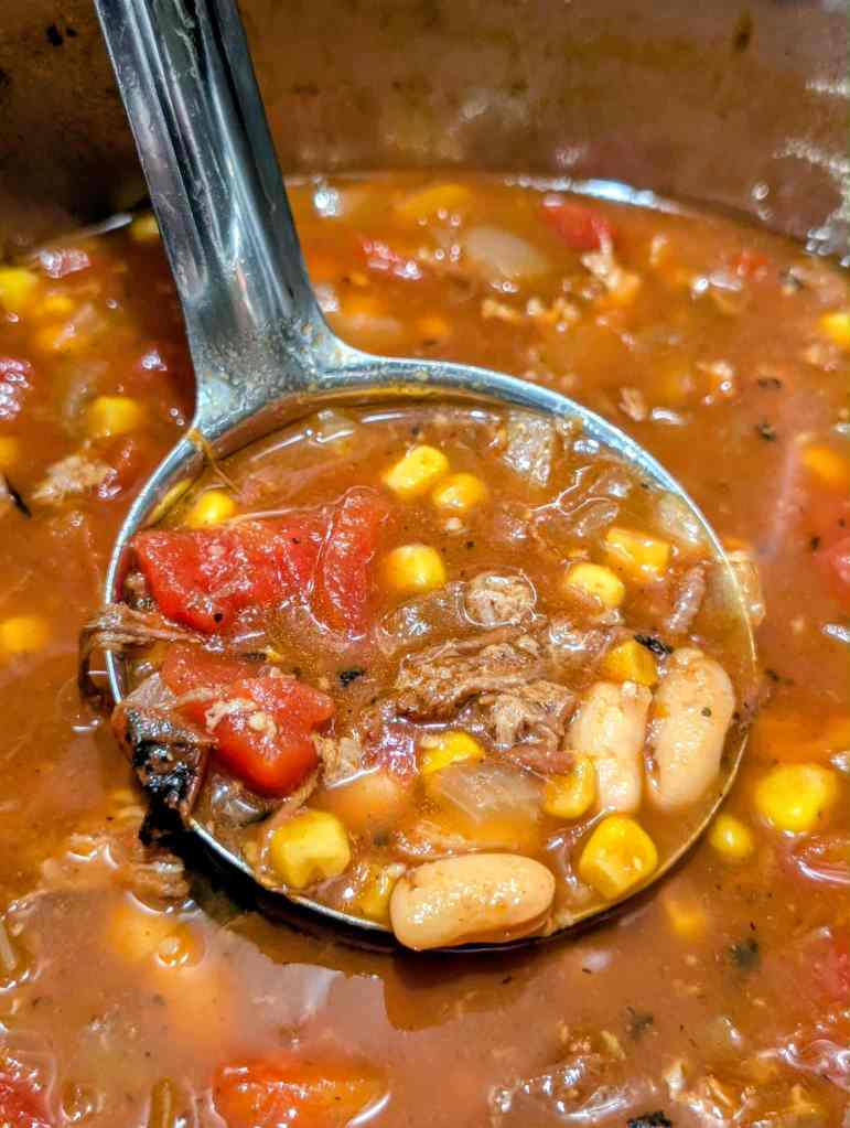 - Add leftover brisket, chicken broth, tomato paste, fire-roasted tomatoes, corn, cannellini beans, and BBQ sauce.