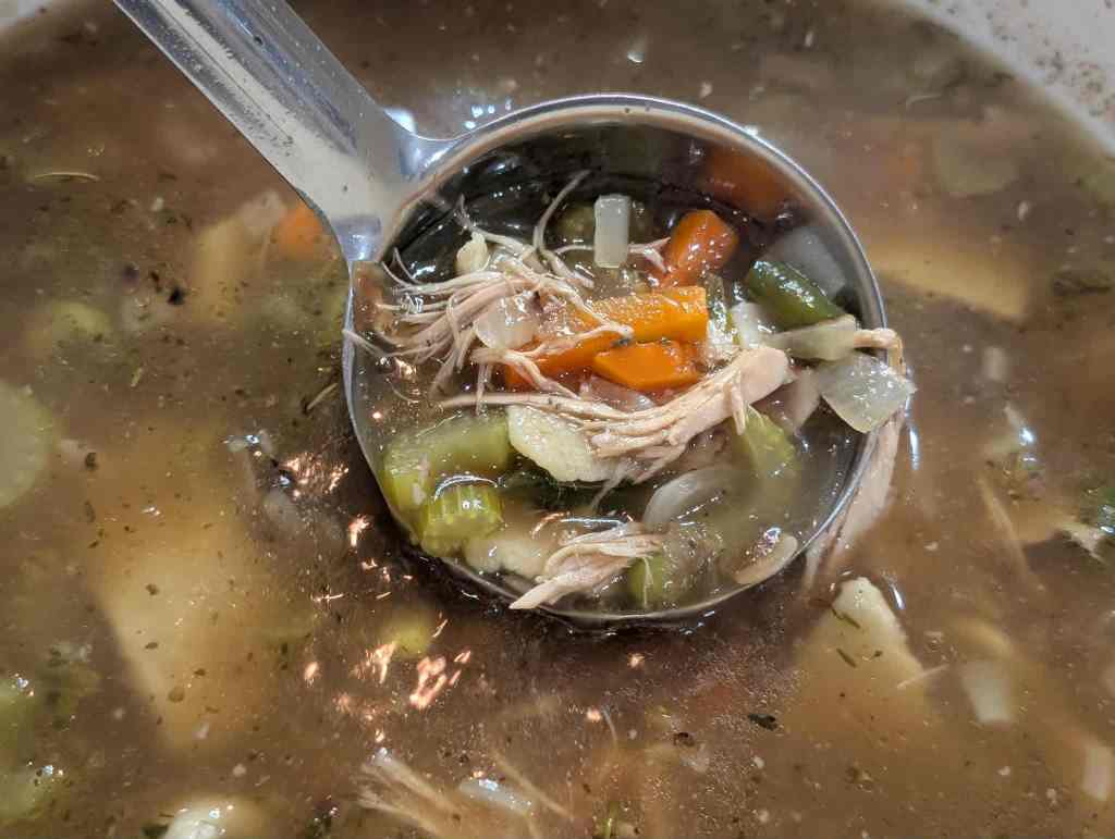 This simple chicken soup is one of the best ways to stretch a roasted chicken into another full meal. Start by simmering the leftover chicken frame to make a rich homemade broth, then add a few basic vegetables and tender hand-rolled noodles for a comforting, old-fashioned supper. This soup is a perfect example of how one chicken can be stretched into multiple meals.