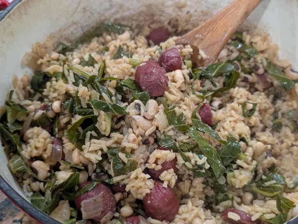 There are many variations and traditions surrounding this dish. For mine, I went back to a simple, economical base recipe and doubled it, using ingredients I already had on hand: black-eyed peas, rice, beef sausage, onion, a handful of greens, and enough broth and water to turn it into a one-pot supper with leftovers for lunch the next day.