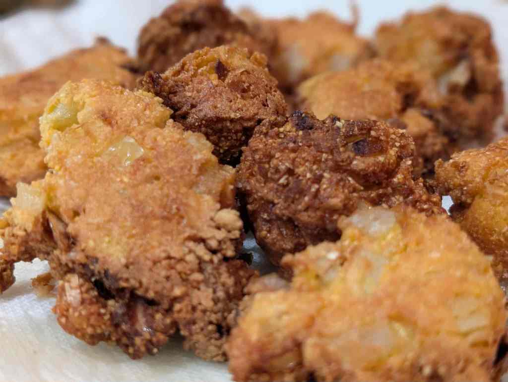 Mix all ingredients together until a thick batter forms. If desired, add a small splash of milk to loosen the batter slightly. Scoop small portions into hot oil and fry until golden brown, turning as needed so they cook evenly.