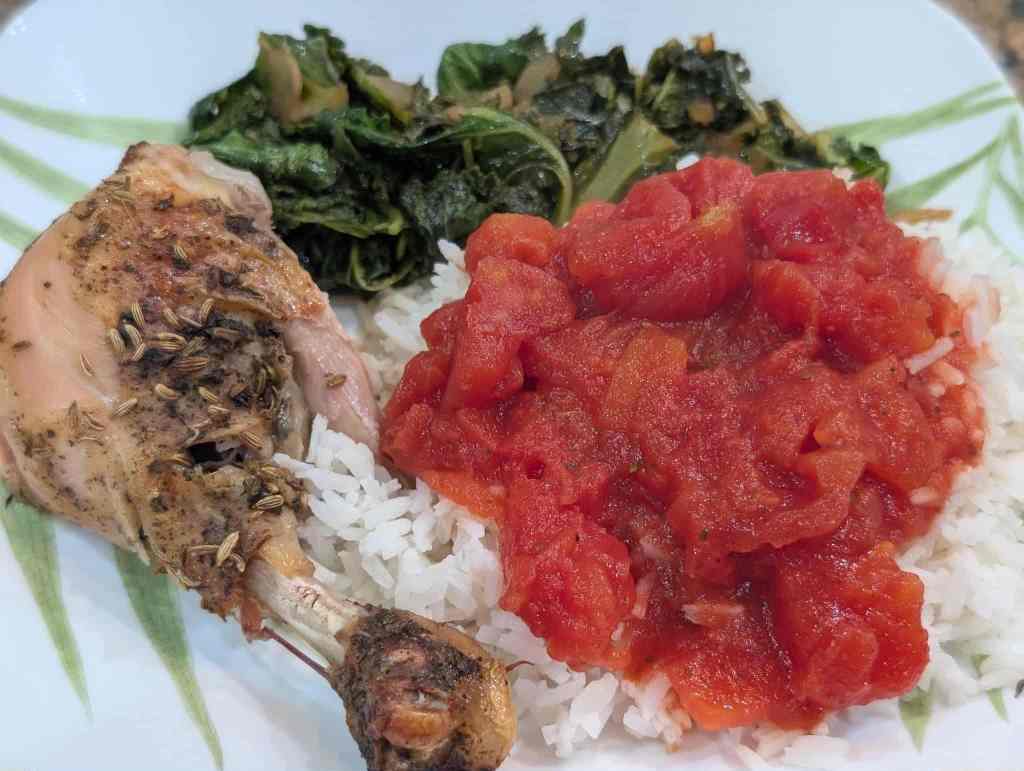 1. Herb-Roasted Chicken Supper with Rice, Stewed Tomatoes, and Turnip Greens